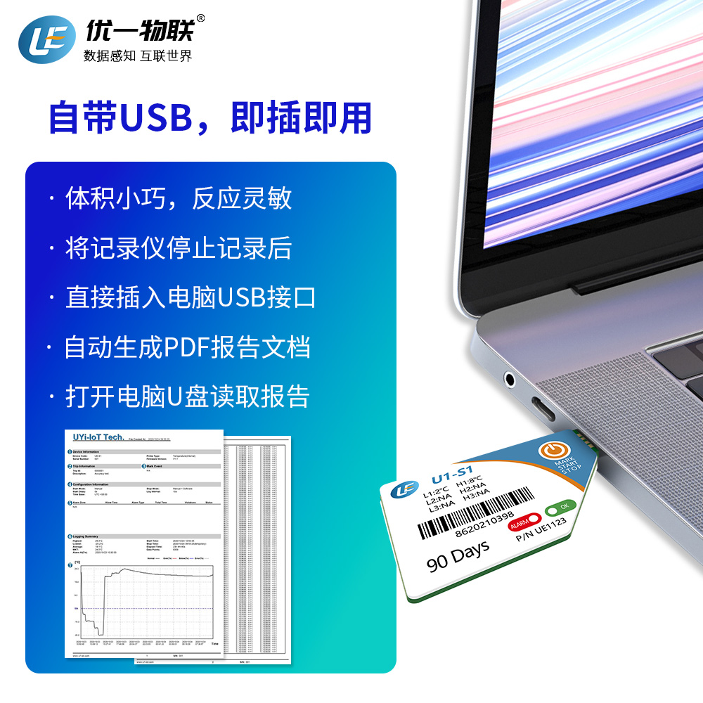 U1-S1是一款應(yīng)用于生物醫(yī)藥箱,集裝箱,冷藏車等場景的一次性PDF溫度記錄儀,高精度,大容量,生成報告表速度快,操作簡單,只需按動一個按鈕便可啟動記錄,常用于低成本跟蹤監(jiān)測冷鏈運輸、食品藥品或其它溫度敏感貨物的運輸安全。