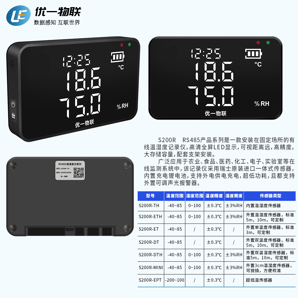 S200R RS485產品系列是一款安裝在固定場所的有線溫濕度記錄儀,高清全屏LED顯示,可視距離遠,高精度,大存儲容量,配套支架安裝。 廣泛應用于農業、食品、醫藥、化工、電子、實驗室等在線監測系統中,該記錄儀采用瑞士原裝進口一體式傳感器,內置充電鋰電池,支持外電供電充電,超低功耗,且都支持外置可調聲光報警器。